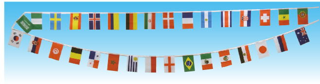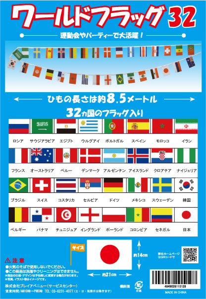 ワールドフラッグ32 定価:880円(新価格) 運動会、パーティーで大活躍!! 32カ国の万国旗になります! 【セット内容&サイズ】・国旗32枚:縦14cm×横21cm ・ヒモの長さ:約8.5m ・素材:ナイロン製